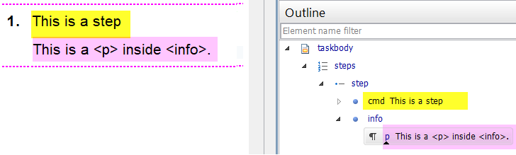 Hi Jang, Just to be sure we are talking about the same thing: Current behavior: What I want is this: I see no point in the current behavior. Why are empty elements marked as "filled" elements in oXygen? *@SyncroSoft* Feature request : Can the current behavior of the Outline view be changed to show empty elements as empty? If the current behavior is required (for whichever reason...), I understand that I'd need to implement DITA contstraints. Can you be more specific about that? How would I do this with oXygen? Regards, Frank ------------------------------------------------------------------------ Am 09.01.2023 um 11:27 schrieb 4everJang:
